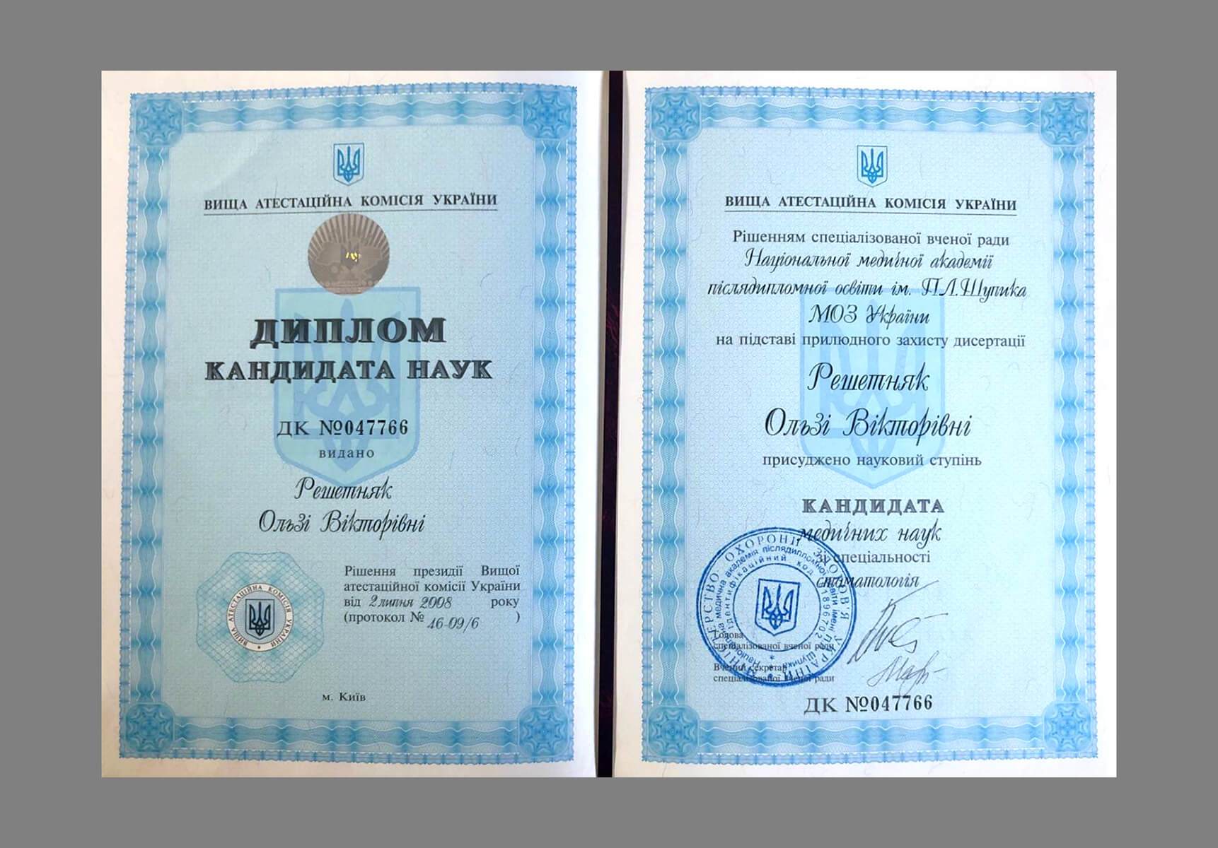 У 2008 році захистила дисертаційну роботу на тему «Лікування кандидозу слизової оболонки порожнини рота у жінок на фоні ХУГП (хронічної урогенітальної патології)».