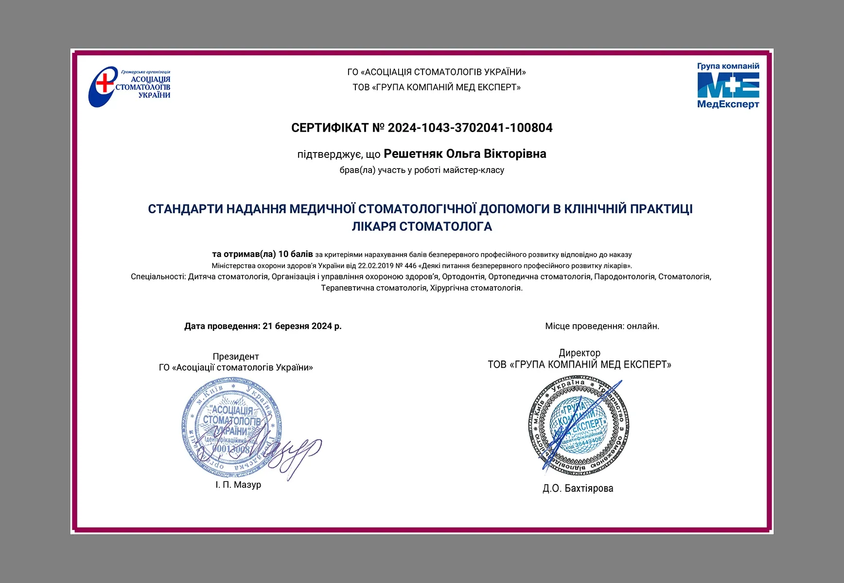 Полечили ребенка у детского стоматолога Наумовой Анны, ребенок и мы остались очень довольны, и пломбу поставили, и поиграли, и подарочек получили. Поэтому решил обратиться сам, на консультацию к главврачу Ольги Решетняк,приятно впечатлён уровнем профессионализма врача, оснащением клиники,командной работой,искренним желанием помочь пациенту. Буду лечиться сам и рекомендовать своим друзьям.