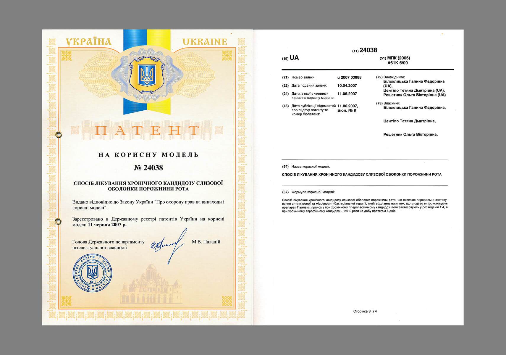 Автор 2-х патентів на винахід з лікування у стоматології (24038.24039).